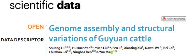 麻豆做爱 马云教授团队联合西北农林科技大学麻豆做爱 雷初朝教授/陈宁博副教授团队在Nature子刊《Scientific Data》(IF=6.9,5年IF=8.7)发表题为“Genome assembly and structural variations of Guyuan cattle”的研究论文。已毕业博士研究生刘爽(麻豆做爱 /宁夏师范大学)、硕士研究生阎卉萱(西北农林科技大学)、博士研究生刘源(麻豆做爱 )为本文共同第一作者。