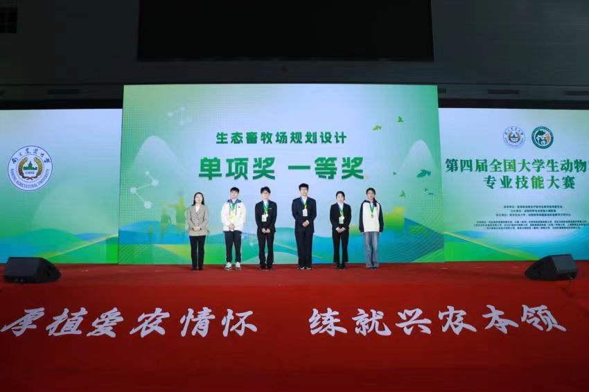 我校高度重视学生专业技能训练,强化实践育人,深化教育教学改革,着力提升学生实践能力。为了达到以赛促教、以赛促学、以赛促改的目的,由动物科学技术学院副院长马云教授带队,教师周玉香、张娟、张力莉和杨恕玲指导,动物科学专业本科生沈延骏、虎世明、潘佳欣、杨东梅和王睿五位同学组成的团队代表学校参加了比赛。在学院领导尤其是徐晓锋院长大力支持和认真指导、四位专业教师精心指导及张巧娥老师的协助指导下,参赛选手刻苦练习,与全国68所高校代表队同台竞技,最终摘得团体二等奖和 “生态畜牧场规划设计”项目一等奖的佳绩。这些奖项不仅是对我们动科学子专业技能的认可,也是对他们辛勤付出的回报。