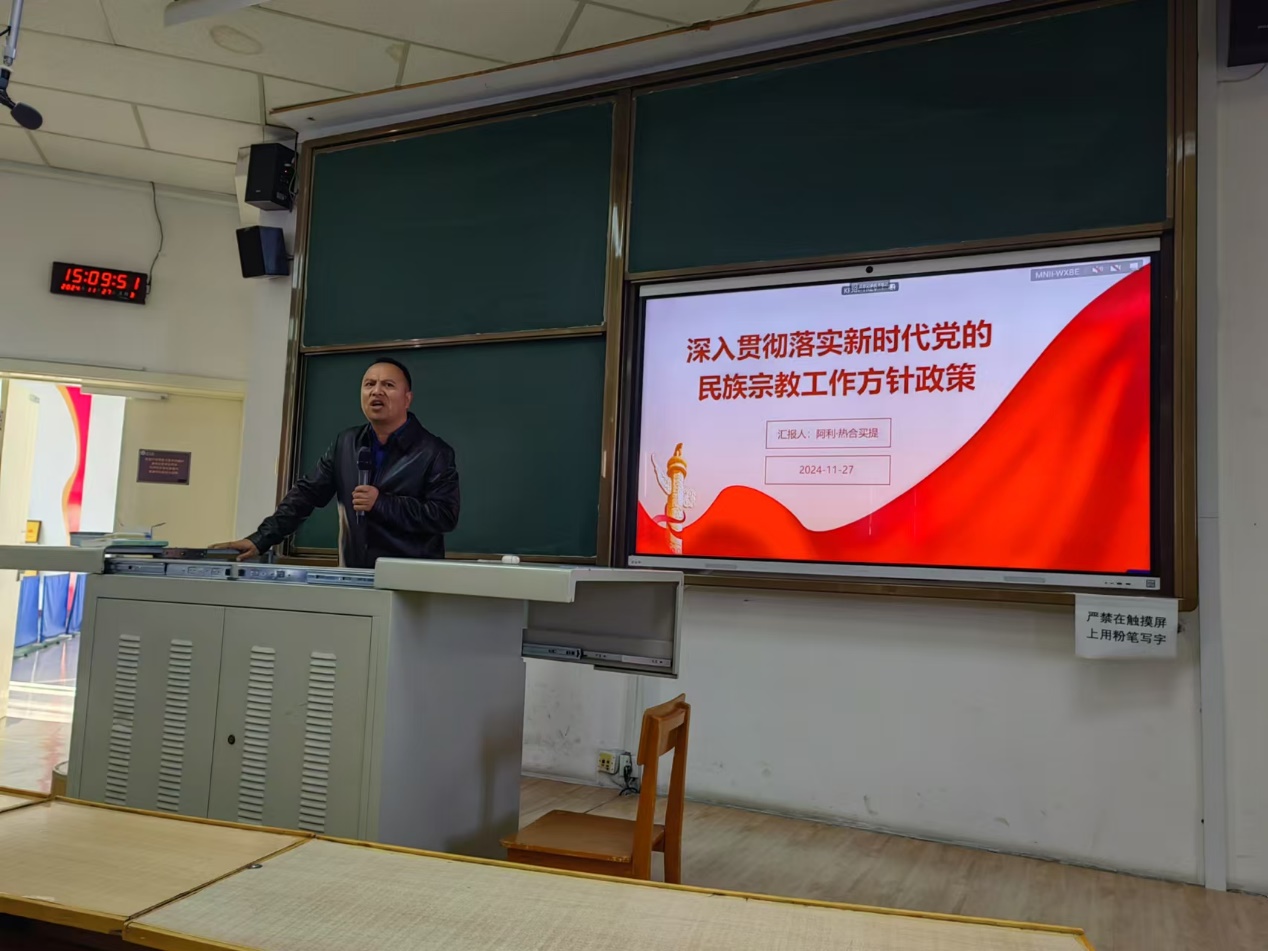 在讲座中,阿利副处长强调:“党的民族宗教政策是国家治理体系的重要组成部分,尤其对于我们广大学生群体,必须牢牢把握民族团结的核心要义,自觉践行政策,为促进民族共同繁荣与进步贡献力量。”他号召学生们在日常学习和生活中,以实际行动推动民族团结,增强社会责任感,成为民族团结的积极推动者。